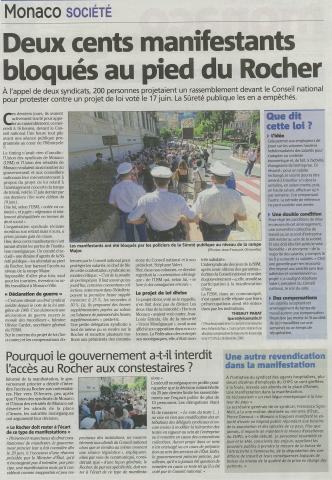 Finalement, plus de 200 personnes, dont certains étaient en grève, n'ont pu manifester devant le Conseil National (Assemblée Nationale monégasque), comme les avaient invité l'Union des Syndicats de Monaco (USM) et l'Union des Retraités de Monaco (URM), mais sont restés au pied du Rocher de Monaco durant plus de deux heures, les agents de la sureté publique bloquant de fait la montée vers celui-ci. Du coup, même les visiteurs de Monaco n'ont pu y accéder, qu'ils aient été à pied, en voiture ou y compris par bus, car ceux-ci étaient détournés.