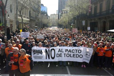 La foto que encabeza este artículo es bien clara y significativa. Dice NO a los Pactos de Toledo, que, todo y ser un muy negativo Pacto Social, aún defienden CCOO y UGT. Es una foto sacada el 17 de marzo de 2.018, en Barcelona, de la cabecera de la gran manifestación de PyJ (Pensionistas y Jubilados). Manifestación convocada por La Marea de Pensionistas, como parte de las casi 200 manifestaciones que la Coordinadora Estatal por la Defensa de las Pensiones Públicas había convocado en igual fecha.