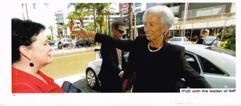 LA DIRECTRICE GÉNÉRAL DU FOND MONÉTAIRE INTERNATIONAL (FMI), CHRISTINE LAGARDE, ET LA SECRÉTAIRE GÉNÉRAL DE LA CONFÉDÉRATION SYNDICALE INTERNATIONALE (CSI), Sharan Burrow, S’ EMBRASENT. CELA MONTRE LA GRANDE AMITIÉ ET ENTRAIDE ENTRE CEUX QUI DIRIGENT LE CAPITALISME ET CEUX QUI FONT SEMBLANCE DE DÉFENDRE LES TRAVAILLEURS