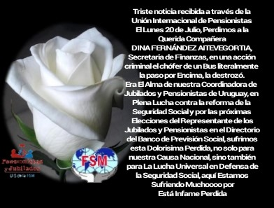 Hola Querido Compañero Quim, lamento comunicarle que en el día de ayer Lunes 20 de Julio, Perdimos a la Querida Compañera Dina Fernández Aitevegortia, Secretaria de Finanzas, en una acción criminal el chófer de un Bus literalmente la paso x Encima, la destrozó, Era El Alma de nuestra Coordinadora de Jubilados y Pensionistas del Uruguay, en Plena Lucha contra la reforma de la Seguridad Social y x las próximas Elecciones del Representante de los Jubilados y Pensionistas en el Directorio del Banco de Previsión Social, sufrimos esta Dolorisima Perdida, no solo para nuestra Causa Nacional, sino