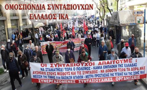 Los pensionados demandamos: Que termine ahora la guerra - Ningún involucramiento de Grecia - Aumento de los salarios y las pensiones - Que se den ahora nuestros extras - Reducción de los precios de los bienes básicos - Medidas de protección de la Salud y de nuestra Vida