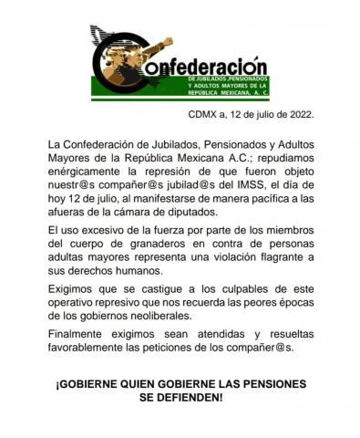 La Nueva Central de Trabajadores (NCT) expresa su solidaridad con la digna lucha de la Alianza Nacional de Jubilados y Pensionados del IMSS, que desde el día martes 6 de julio realizan un plantón indefinido instalado en las oficinas centrales del Instituto Mexicano del Seguro Social en la ciudad de México, para demandar la recuperación de los ahorros de cesantía, vejez y cuota social depositados en las afores.