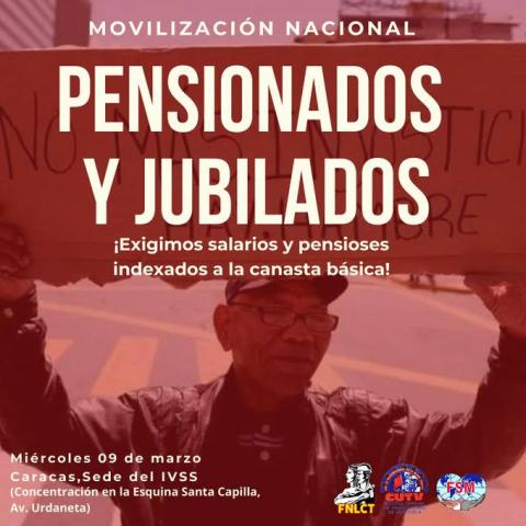 Convocamos a las y los trabajador@s activos y jubilados a la JORNADA NACIONAL DE PROTESTA DE PENSIONADOS Y JUBILADOS Frente a las sedes del IVSS Miércoles 9 de marzo 9:00 AM Exijamos cumplimiento del art 91 de la CRBV ¡Por salarios y pensiones indexados a la canasta básica!